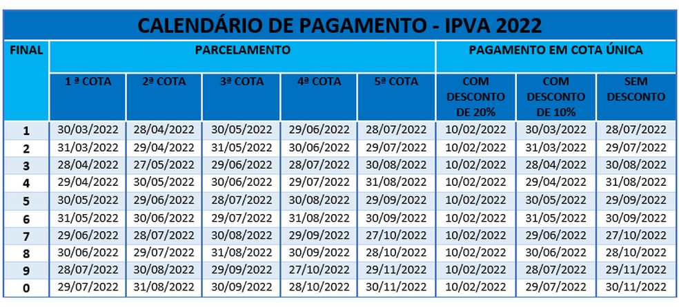 A data de vencimento do imposto varia de acordo com o número final da placa do veículo. O parcelamento em cinco vezes poderá ser feito a partir de março, quando tem início o calendário que fixa os prazos para início do pagamento parcelado, conforme o número final da placa do veículo.