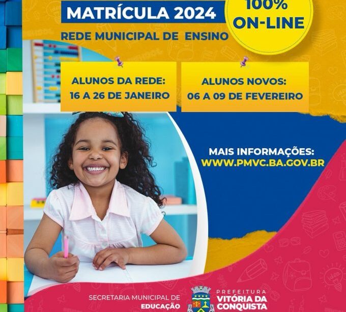 A Prefeitura de Vitória da Conquista, por meio da Secretaria Municipal de Educação (Smed), informa que, na próxima sexta-feira (26), termina o prazo de matrícula para os alunos egressos da rede municipal, ou seja, aqueles que por algum motivo estão mudando de uma unidade para outra.