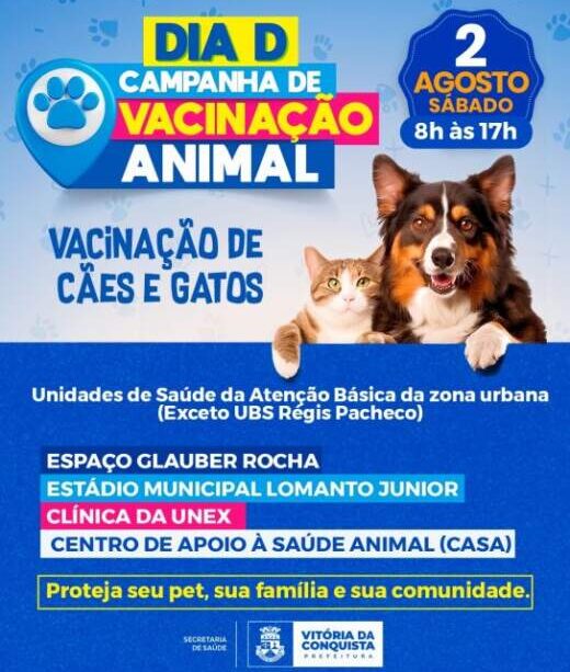 Sábado (2) é dia de proteção de cães e gatos com três meses de vida ou mais. Para garantir uma ampla cobertura vacinal na cidade, a Secretaria Municipal de Saúde vai realizar o Dia D da Campanha Antirrábica em todas as unidades de saúde, da 8h às 17h, com exceção da Unidade Régis Pacheco, que será utilizada como referência para casos de acidentes.