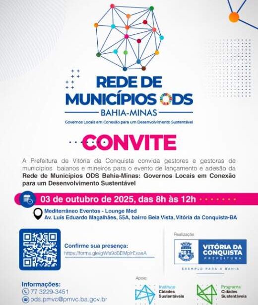 A Prefeitura de Vitória da Conquista realiza nesta sexta-feira (3), o lançamento e adesão da Rede de Municípios ODS Bahia-Minas Gerais: Governos locais em conexão para um desenvolvimento sustentável, com a participação exclusiva de gestores municipais dos dois estados. O evento acontece no Mediterrâneo Eventos Lounge Med, das 8h às 12h.